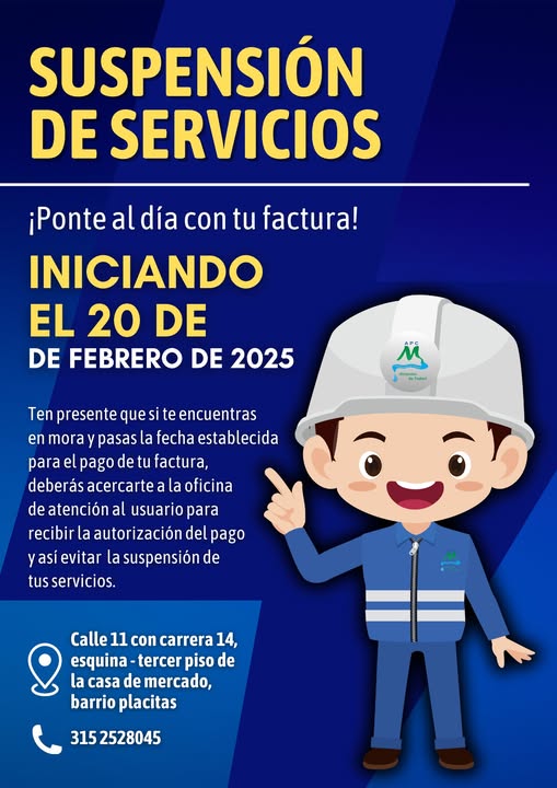 Iniciamos con la suspensión de servicios 20 febrero, 2025 Auxiliar Administrativo Noticias Recuerda realizar el pago de tu factura en los tiempos señalados y/o acércate a nuestra oficina Atención a Usuarios.Líneas de atención: Atención a Usuarios:315 2528045 Atención a Emergencias: 320 3606663 APC Manantiales de Chucurí, Empresa de todos y para todos#Acueducto #alcantarillado #aseo