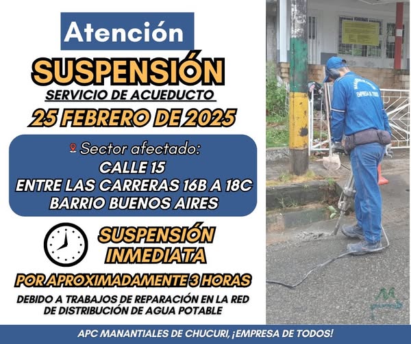 SUSPENSIÓN TEMPORAL DEL SERVICIO DE ACUEDUCTO 25 febrero, 2025 Auxiliar Administrativo Noticias Sector Afectado: CALLE 15 ENTRE LAS CARRERAS 16B A 18C BARRIO BUENOS AIRES Fecha: 25 de febrero de 2025.Horario: Inmediata.Motivo: DEBIDO A TRABAJOS DE REPARACIÓN EN LA RED DE DISTRIBUCIÓN DE AGUA POTABLE. APC Manantiales de Chucurí, Empresa de todos.#Acueducto #alcantarillado #aseo
