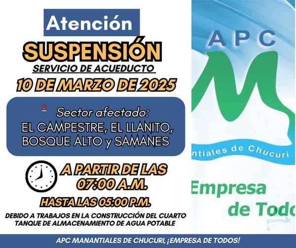 SUSPENSIÓN TEMPORAL DEL SERVICIO DE ACUEDUCTO 7 marzo, 2025 Auxiliar Administrativo Noticias Sector Afectado: barrios EL CAMPESTRE, SAMANES, EL LLANITO Y BOSQUE ALTO. Fecha: 10 de marzo de 2025.Horario: a partir de las 07:00 a.m. hasta las 05:00 a.m.Motivo: DEBIDO A TRABAJOS DE CONSTRUCCIÓN DEL CUARTO TANQUE DE ALMACENAMIENTO DE AGUA POTABLE. APC Manantiales de Chucurí, Empresa de todos.#Acueducto #alcantarillado #aseo