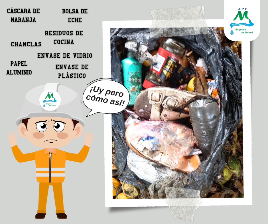 Se supone que esta bolsa solo debía contener residuos orgánicos, pero encontramos de todo: plásticos, vidrios, chanclas y hasta papel aluminio.