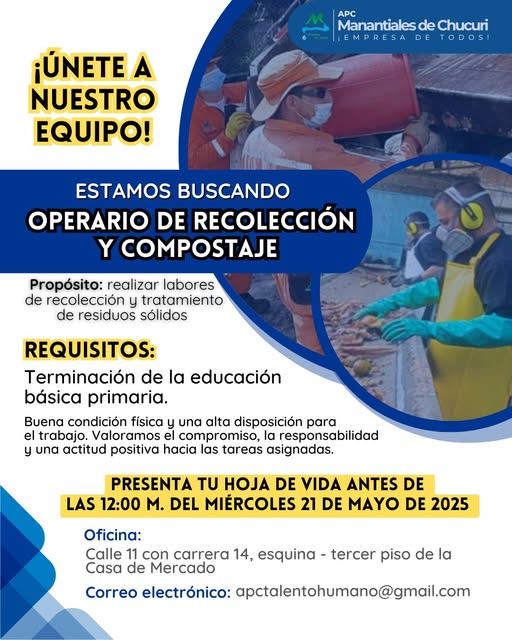 En Apc Manantiales de Chucuri estamos buscando: Operario de Recolección y Compostaje.