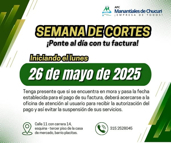 Iniciamos con la suspensión de servicios 26 mayo, 2025 Auxiliar Administrativo Noticias Iniciamos con la suspensión de serviciosRecuerda realizar el pago de tu factura en los tiempos señalados y/o acércate a nuestra oficina Atención a Usuarios.Líneas de atención: Atención a Usuarios:315 2528045 Atención a Emergencias: 320 3606663APC Manantiales de Chucurí, Empresa de todos y para todos