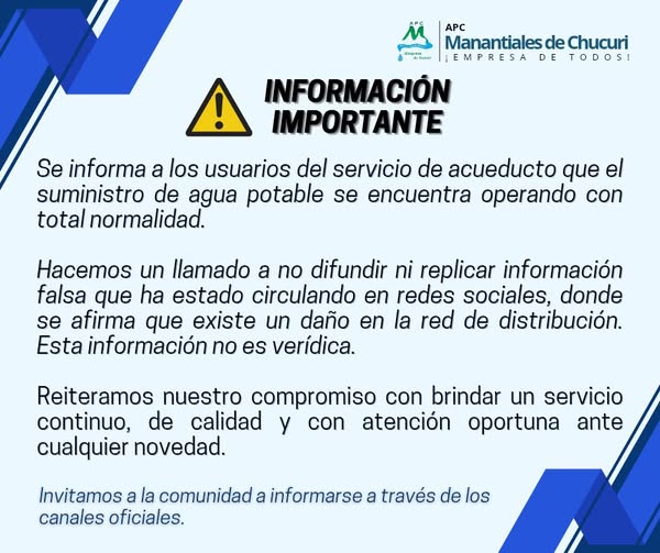 Se informa a los usuarios del servicio de acueducto que el suministro de agua potable se encuentra operando con total normalidad.