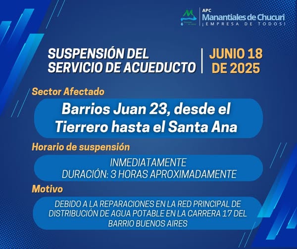 Informamos la suspensión temporal del servicio de acueducto hoy, 18 de junio de 2025, en los sectores: