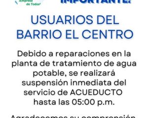 Debido a reparaciones en la planta de tratamiento de agua potable, se realizará suspensión inmediata del servicio de ACUEDUCTO hasta las 05:00 p.m. Agradecemos su comprensión. APC MANANTIALES DE CHUCURI,