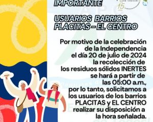 Por motivo de la celebración de la Independencia el día 20 de julio de 2024 la recolección de los residuos sólidos INERTES se hará a partir de las 05:00 a.m.,