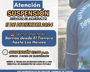 Sector Afectado: Barrios desde el sector EL TIERRERO hasta el barrio LOS HÉROES Fecha: 11 de diciembre de 2024.Horario: Inmediata con duración de 3 Horas aproximadamente.Motivo: Reparación en la red