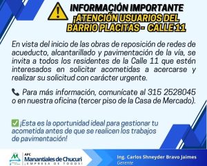 ¡Información importante para la comunidad del barrio Placitas!Invitamos a los usuarios de la Calle 11 que aún no cuenten con acometidas domiciliarias de acueducto y/o alcantarillado, a realizar su solicitud