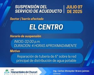 Informamos la suspensión temporal del servicio de acueducto hoy, 07 de junio de 2025, en en le barrio EL CENTRO: Sector Afectado: Barrio El Centro. Inicio: 02:00 p.m. Duración estimada: