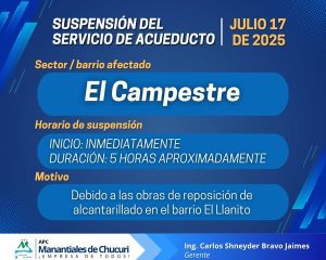 Informamos la suspensión temporal del servicio de acueducto hoy, 17 de julio de 2025, en en le barrio EL CAMPESTRE: Sector Afectado: Barrio El Campestre. Inicio: INMEDIATAMENTE. Duración estimada: 5