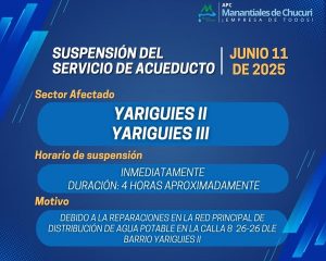 Informamos la suspensión temporal del servicio de acueducto hoy, 11 de junio de 2025, en los sectores: Yariguíes II y Yariguíes III Inicio: inmediato Duración estimada: 4 horas Motivo: Reparaciones