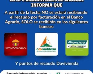 la APC MANANTIALES DE CHUCURI informa que A partir de la fecha NO se estará recibiendo el recaudo por facturación en el Banco Agrario