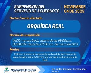 Informamos la suspensión temporal del servicio de acueducto iniciando el día de hoy, martes 04 de noviembre de 2025. Sector Afectado: La Orquídea Real Inicio: Martes 04 de noviembre desde