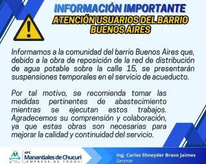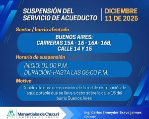 Informamos la suspensión temporal del servicio de acueducto para el día de hoy, jueves 11 de diciembre de 2025. Sector Afectado: BUENOS AIRES: CARRERAS 15A – 16 – 16A- 16B;