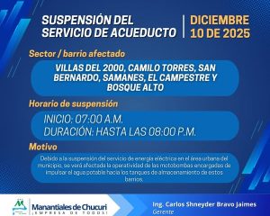 Informamos la suspensión temporal del servicio de acueducto para el día de mañana, miércoles 10 de diciembre de 2025. Sector Afectado: VILLAS DEL 2000, CAMILO TORRES, SAN BERNARDO, SAMANES, EL