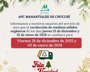 Informamos a todos nuestros usuarios que, debido a las festividades de fin de año, realizaremos ajustes en las fechas de recolección de residuos sólidos orgánicos.Agradecemos su comprensión y colaboración para